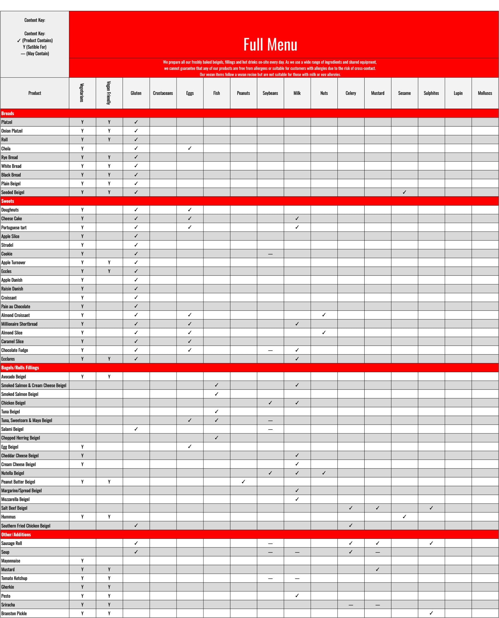 Below you will find information covering the full range of Beigel Bake products sold in our shop and online. Each item lists key allergens for quick and easy reference. If a product contains a particular allergen, it will be clearly marked in the corresponding column. Please note: while a product may not include a specific allergen in its recipe, we cannot guarantee that any item is completely free from allergens. Recipes and ingredients may change from time to time, so we always recommend reviewing this guide and checking labels or in-store signage regularly.